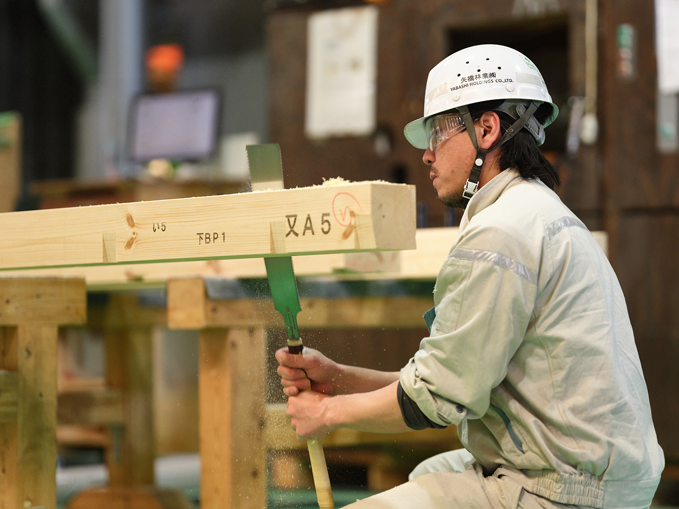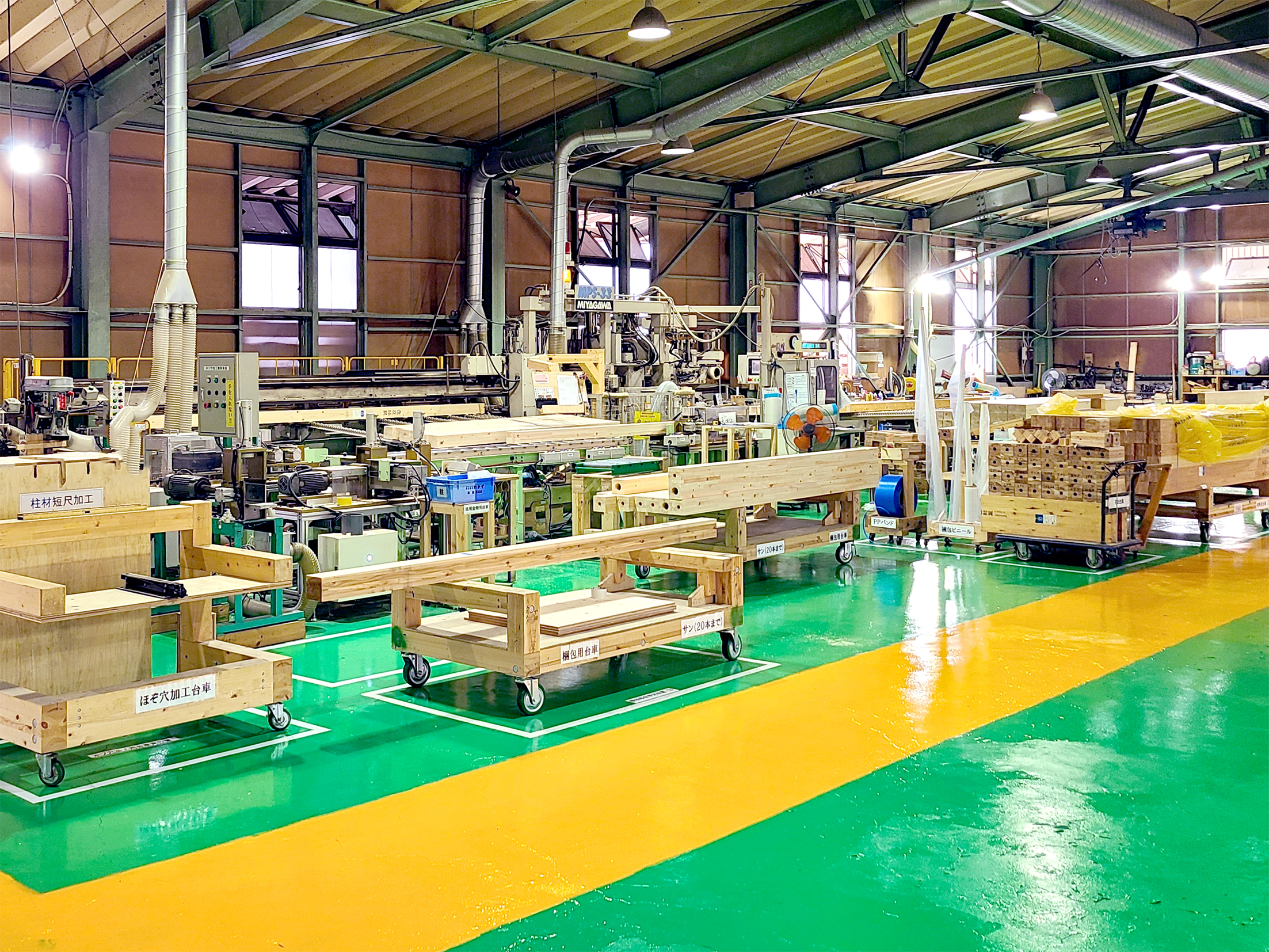 工場では「安全第一」を基本とし、5Sや2H2C※を徹底して、整った作業環境のもと、安全性の向上と高品質なものづくりを実現しています。自社物件はもちろん、大手ハウスメーカーの指定工場としても加工を担い、精度・品質管理・設備体制など多くの項目で高い評価を獲得。精度の高いCAMデータをもとに構造材・羽柄材を加工し、厳しい品質基準をクリアした製品を安定供給しています。 また、自社加工機の導入や技術力向上、現場改善への継続的な取り組み、そして社員一人ひとりの高い意識が、生産性と品質のさらなる向上を支えています。※2H2C:ヒューマンエラー・ヒヤリハット、クレーム・クレーム予備軍への取り組み