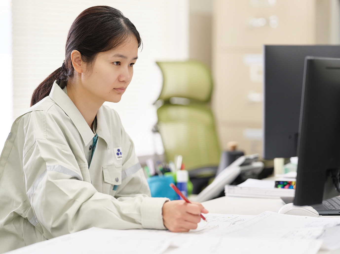 設計部で作成した建築図面をもとに、CAD・CAMデータをグループ会社(ベトナム・ミャンマー)で作成し、自社プレカット工場で木材を加工しています。CAD事業は約400名のオペレーターが従事し、建築・機械・IT分野など年間約35,000棟の実績を支えています。高品質・高精度な建材を安定供給し、標準化による効率的な生産とコスト削減も実現。構造や造園などの図面はすべてお施主様にお渡ししており、当社の設計図書は住宅の保証書とも言える存在です。