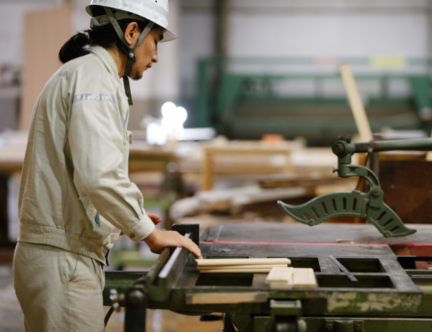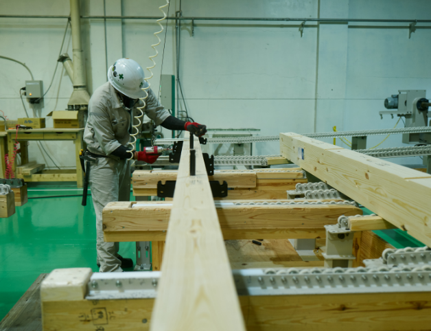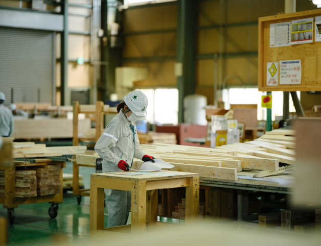 工場では「安全第一」を基本とし、5Sや2H2C※を徹底して、整った作業環境のもと、安全性の向上と高品質なものづくりを実現しています。自社物件はもちろん、大手ハウスメーカーの指定工場としても加工を担い、精度・品質管理・設備体制など多くの項目で高い評価を獲得。精度の高いCAMデータをもとに構造材・羽柄材を加工し、厳しい品質基準をクリアした製品を安定供給しています。 また、自社加工機の導入や技術力向上、現場改善への継続的な取り組み、そして社員一人ひとりの高い意識が、生産性と品質のさらなる向上を支えています。※2H2C:ヒューマンエラー・ヒヤリハット、クレーム・クレーム予備軍への取り組み