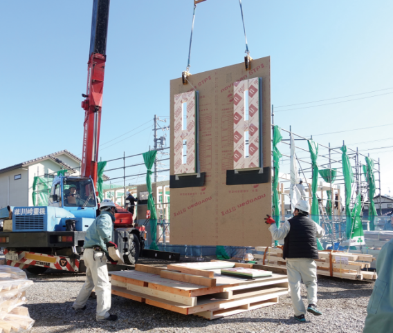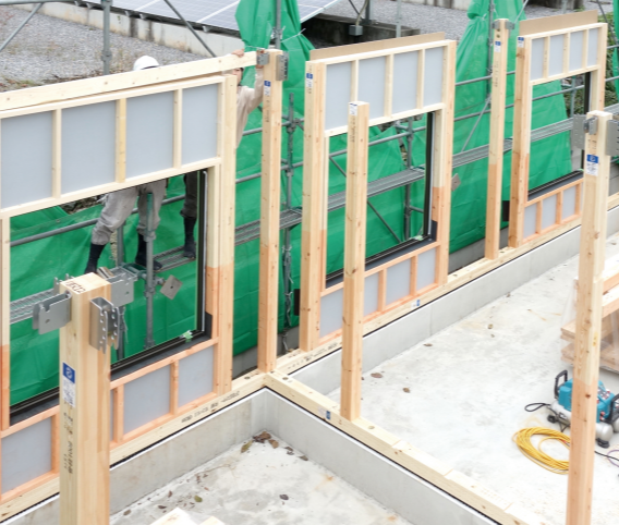 施工は「柱を立てる」「パネルを設置する」「梁を組む」の3ステップで完了。外壁が一気に囲われるため、上棟後の工程を大幅に短縮できます。建築現場の人手不足が深刻な中、効率的な施工で工期短縮に貢献します。