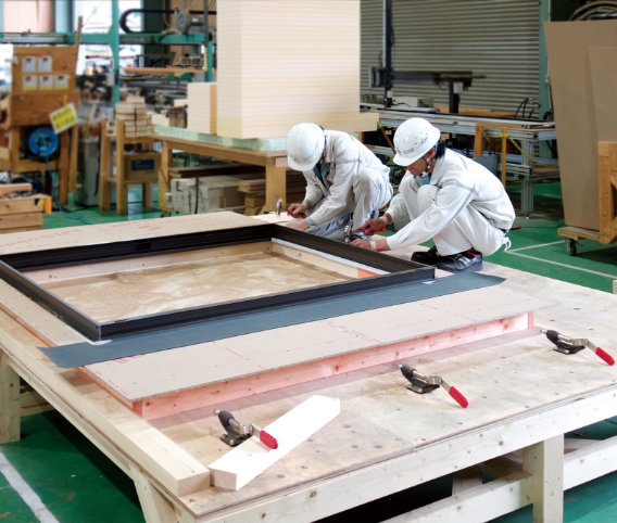 プレメイクパネルは、間柱・面材・サッシ・断熱材を一体化した高精度・高品質の壁パネルです。自社プレカット工場で正確に加工し、専門技術者が丁寧に組み立てています。大手ハウスメーカー向けのプレカットにも対応しており、安定した生産体制を実現しています。