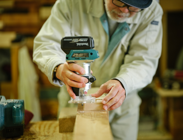 直接手に触れるところには、木の温もりを感じる造作材をふんだんに使用しています。手仕事による造作材には、長年にわたり磨き上げてきた匠の技が随所に活かされています。手仕事にしか出せない風合いや温もりを大切にしながら、必要に応じて機械も活用しています。大切なのは、“手加工ができる技術者”が“機械を使って加工する”ということ。その技術の確かさが、製品の仕上がりに大きく影響します。
