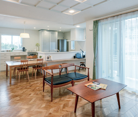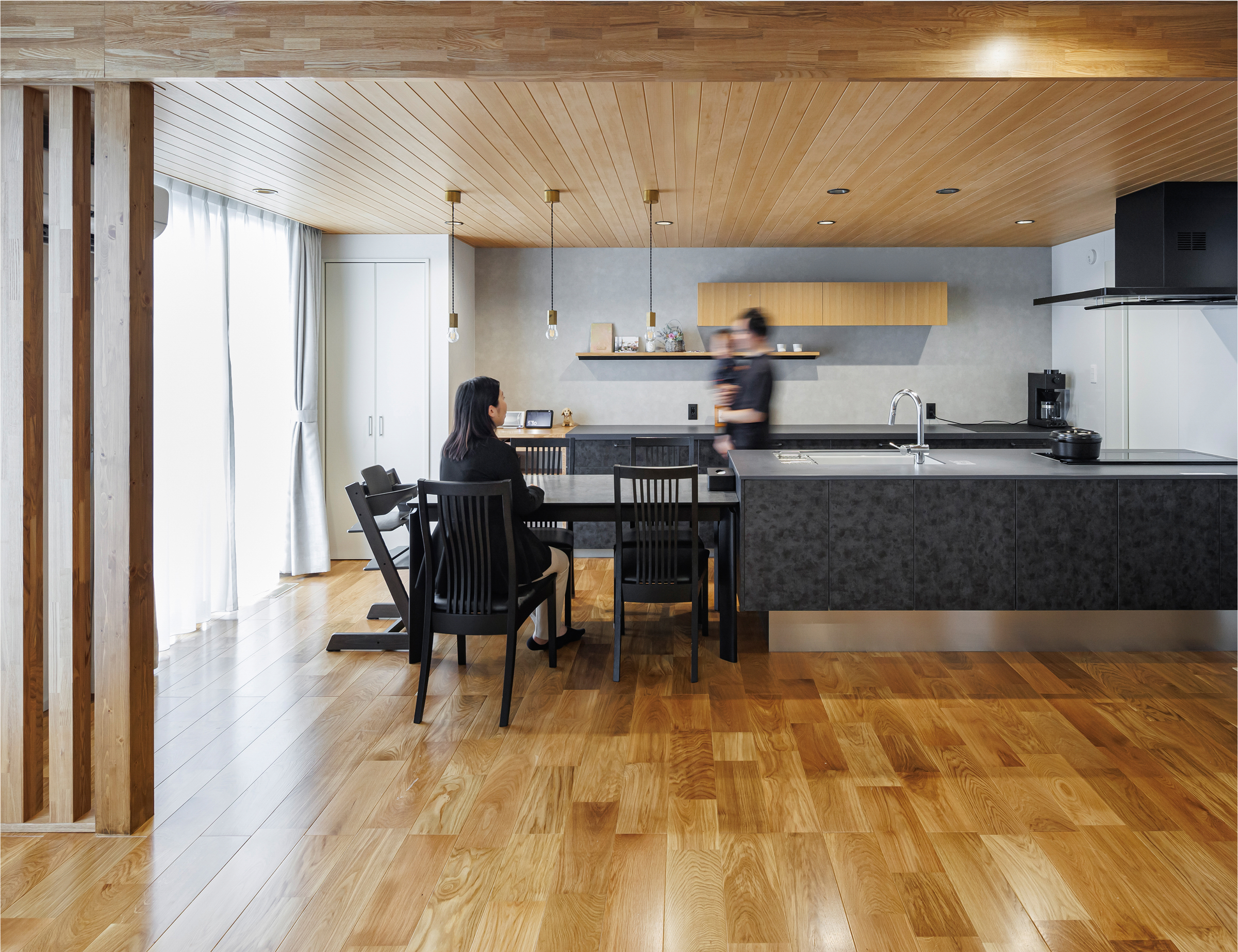 その根底には、確かなポリシーと、デザインの意図を深く理解した職人の技術があります。無垢のフローリングはもちろん、ドアや建材に至るまで、自社で丁寧に加工・塗装。触れた瞬間に伝わる木の温もりを大切にしながら、住まうほどに風合いが深まる“経年美化”の魅力を引き出しています。笠木や窓台には、触れても痛くないよう、やさしい面取り加工を施しました。毎日触れる場所だからこそ、心地よく、美しくあることにこだわっています。