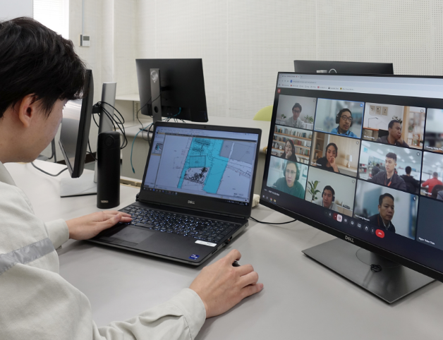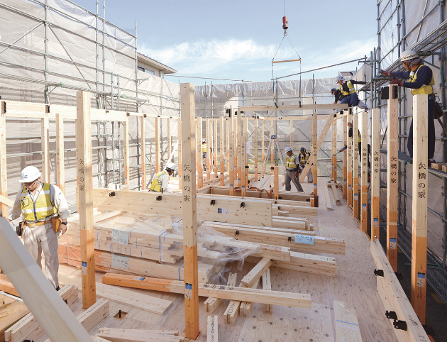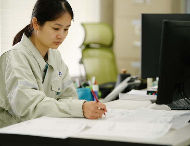 設計部で作成した建築図面をもとに、CAD・CAMデータをグループ会社(ベトナム・ミャンマー)で作成し、自社プレカット工場で木材を加工しています。CAD事業は約400名のオペレーターが従事し、建築・機械・IT分野など年間約35,000棟の実績を支えています。高品質・高精度な建材を安定供給し、標準化による効率的な生産とコスト削減も実現。構造や造園などの図面はすべてお施主様にお渡ししており、当社の設計図書は住宅の保証書とも言える存在です。