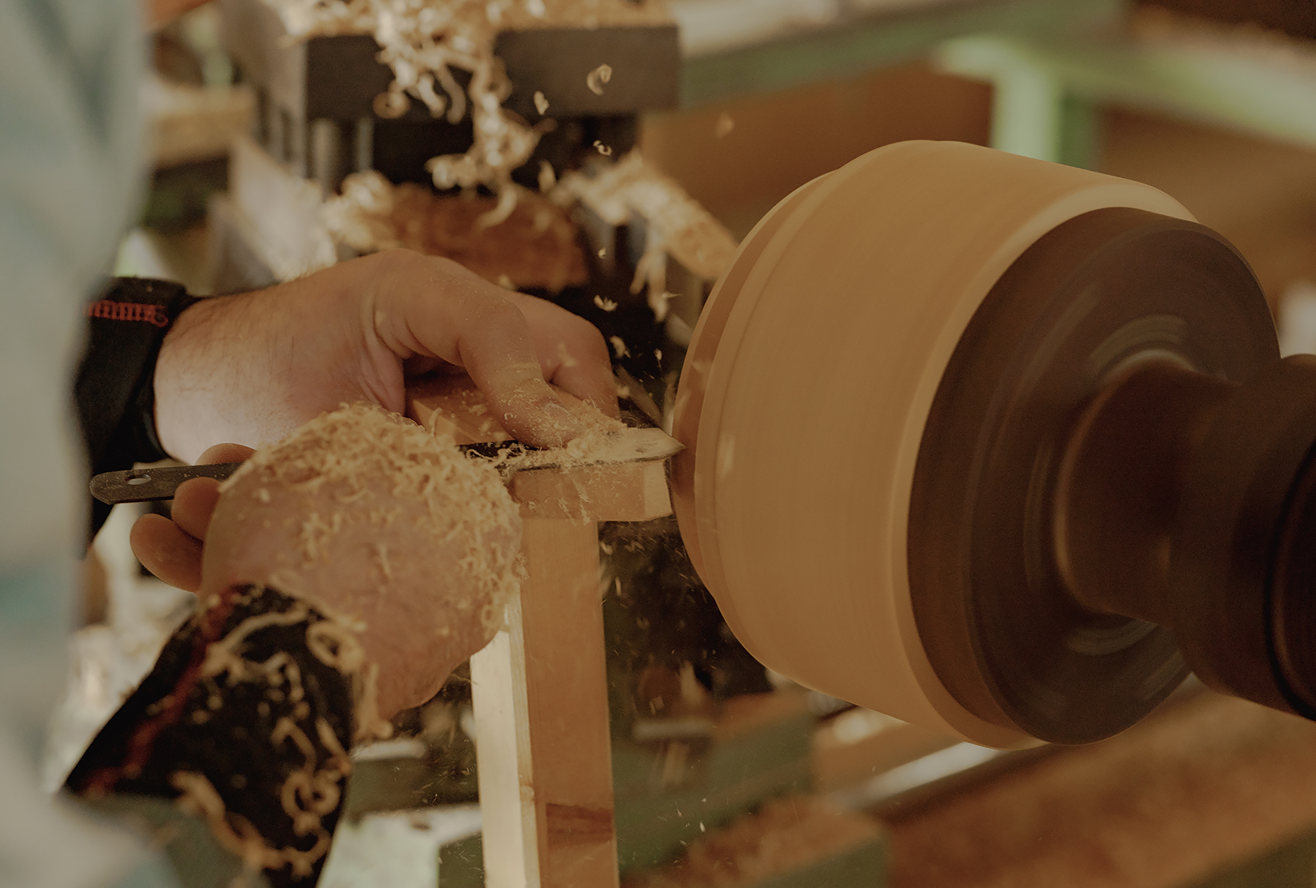 外側挽き:充分に乾燥させた木材をろくろで一つ一つ削り出し、細かな部分は全て手作業で仕上げます。