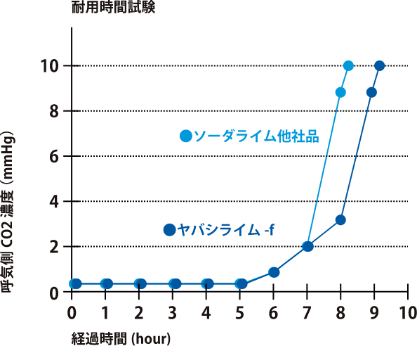 比表面積の高い特殊形状と特殊成分により高い吸収性能を実現しました。他のソーダライムと比較しても十分な吸収性能を有しています。