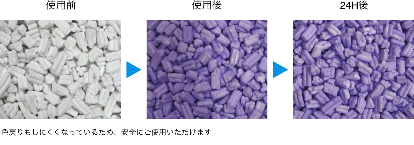 ヤバシライム®-f は二酸化炭素と反応すると青紫色に変色しますが、あくまでも目安として交換のタイミングはCO2モニターによりご判断下さい。