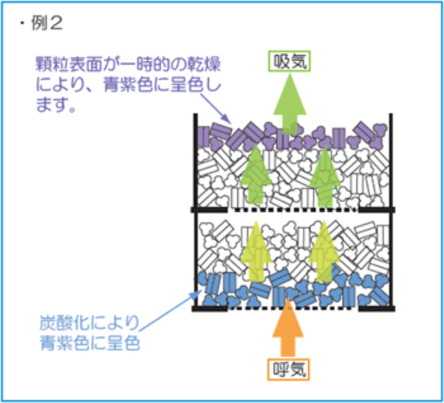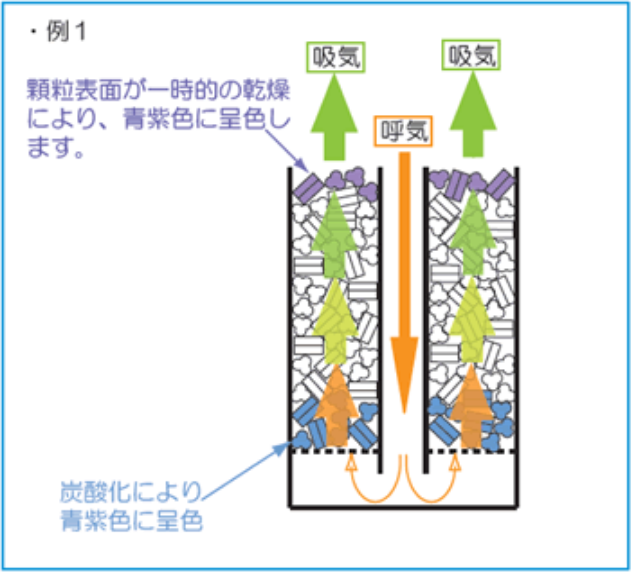 この着色は水分の内部移動や再配分により解消されます。二酸化炭素ガスの吸収能力にはなんら問題はありませんので、そのまま続けてお使い下さい。