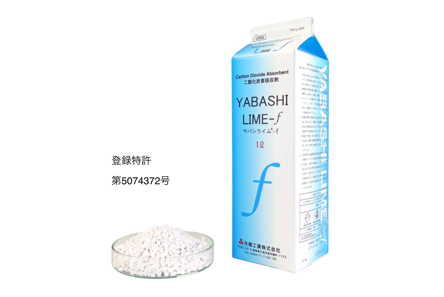 ヤバシライム®-f は、吸入麻酔薬の使用時に二酸化炭素を吸収することを目的とした製品であり、「NaOH」を用いない新しい二酸化炭素吸収剤です。 有害な麻酔薬分解物が発生しないため、安全に麻酔を行うことができます。また、パッケージに遮光性、密閉性、利便性に優れる「特殊加工の1L紙パック」を採用しました。使いきり包装で、廃棄物処理コストの削減にも貢献します。その他に、呼吸機能検査、分析機器においてCO2の除去目的としても利用できます。