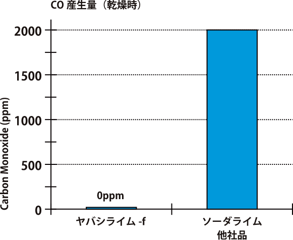 一般的にソーダライムは乾燥時異常発熱により吸入麻酔薬(イソフルラン / デスフルラン)と反応しCO(一酸化炭素)を産生させますが、ヤバシライム®-f はNaOHを用いていないので不慮に吸収剤を乾燥させてしまった場合でもCOを産生させません。