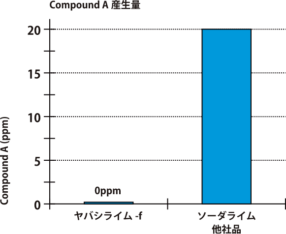 ヤバシライム®-f は吸入麻酔薬(セボフルラン)を分解させる主な原因であるNaOHを用いておりません。そのため一般的なソーダライムとは異なりCompound Aを産生しません。Compound Aが発生しやすい低流量麻酔でも安全に使用することができます。
