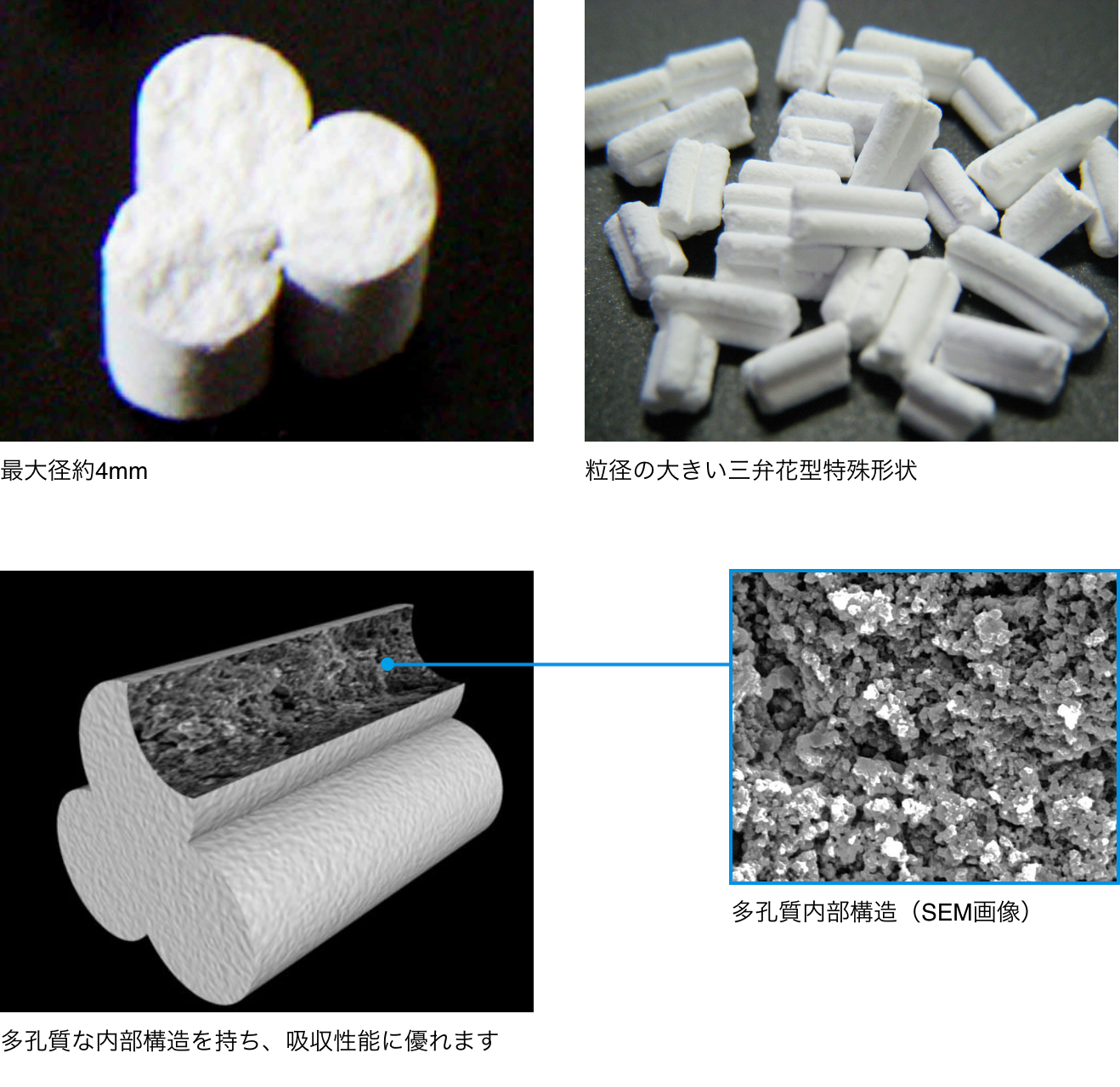 独自技術により三弁花型の特殊形状を実現しました。強度が高く、粉化し難いためハンドリング性に特に優れています。また、粒径も大きいため多くの麻酔器、肺機能測定装置でご使用いただけます。