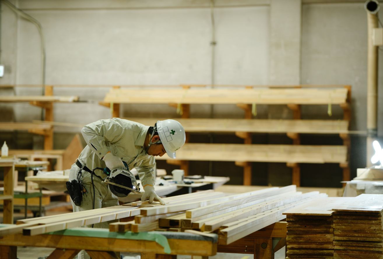 私は大工として木造住宅の建築に携わり、現場では仲間と相談しながら構造材を組み立て、内装の下地から仕上げの化粧材まで、家づくりのあらゆる工程に関わっています。